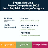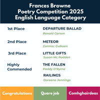 - Winning entries will be announced and awarded on Friday 10 October 2025 in person at the Frances Browne Poetry Competition Awards Ceremony in Kee's Hotel, Stranorlar, Co. Donegal